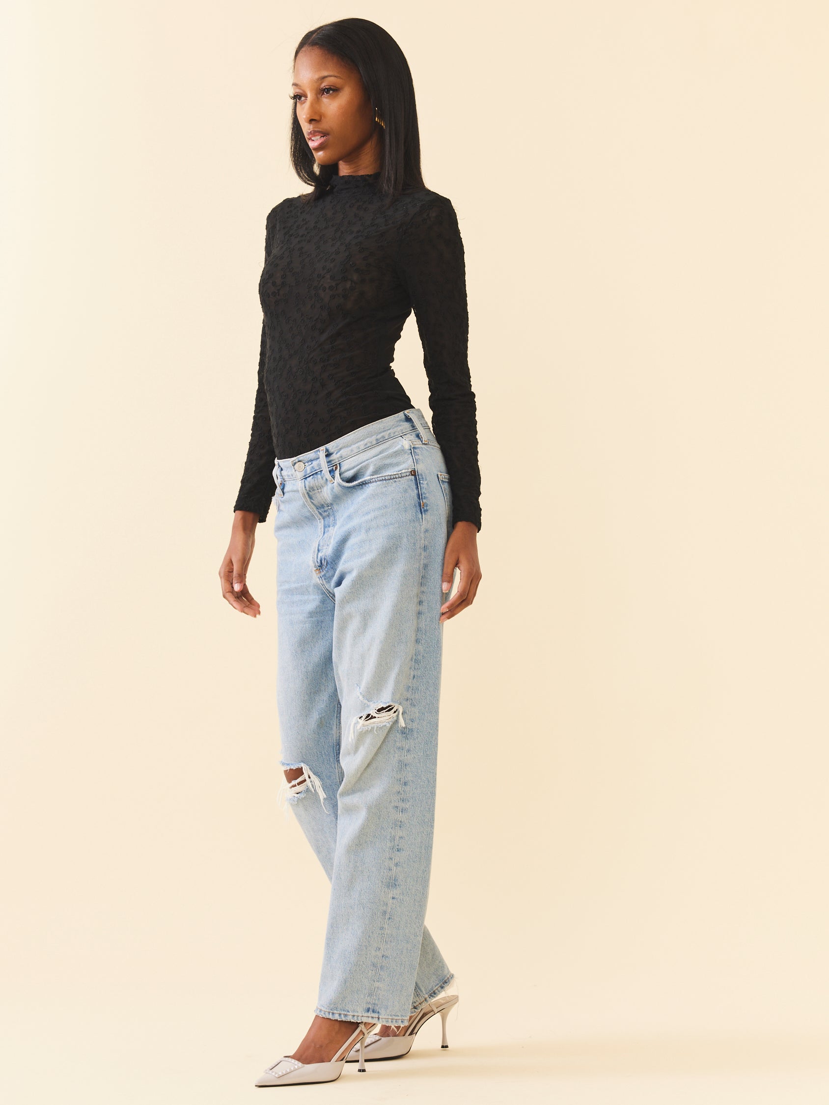 Basics don't mean boring. Meet The Rose Lace Bodysuit. A mock neck, long sleeve bodysuit decorated in dainty lace rose. This top is crafted in semi-sheer, double lined mesh designed to have a slimming fit while enough stretch to give you room to breathe. Wear with your favorite pair of denim or pair layer under a dress. Pairs well layered under the Daisy Dress.
