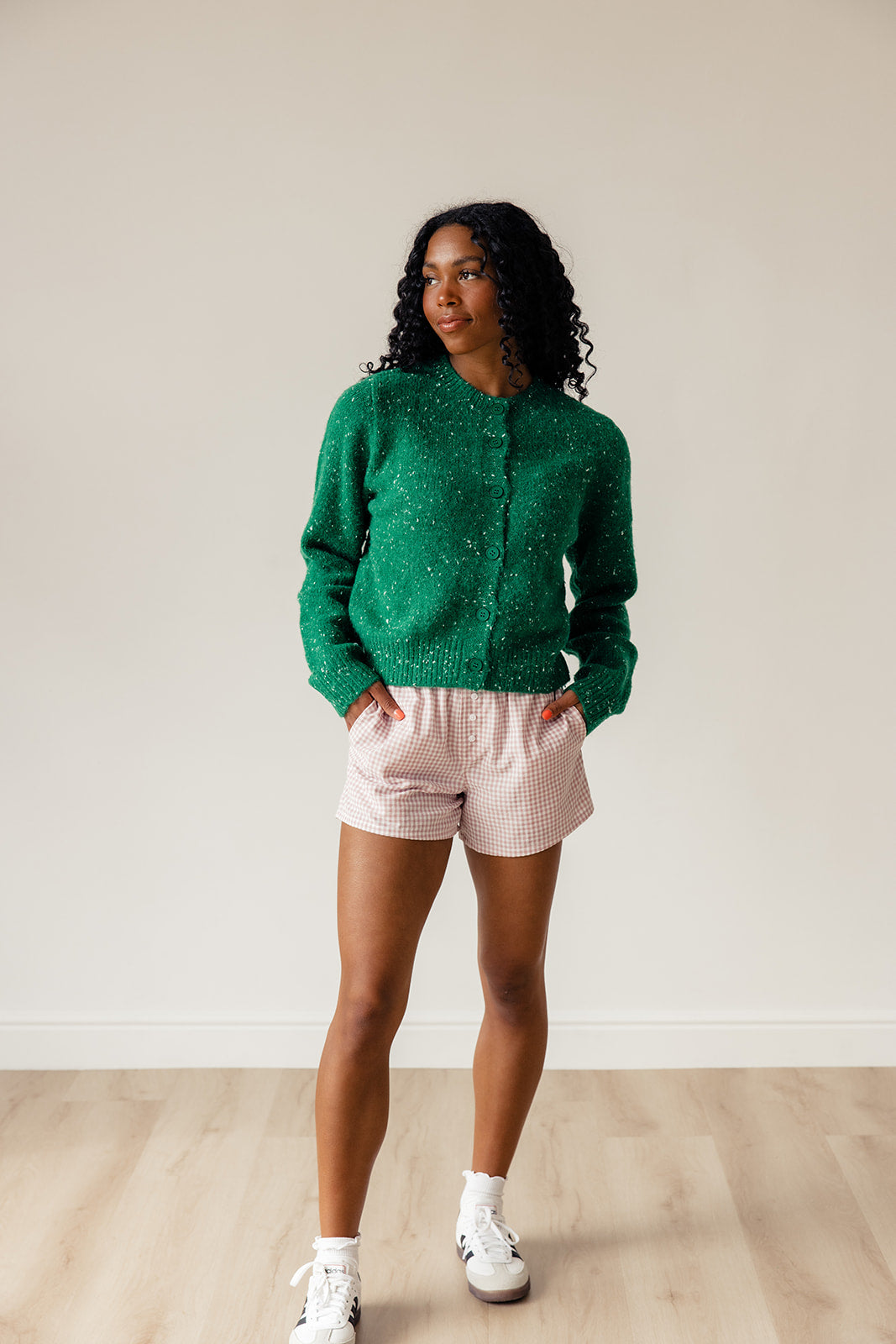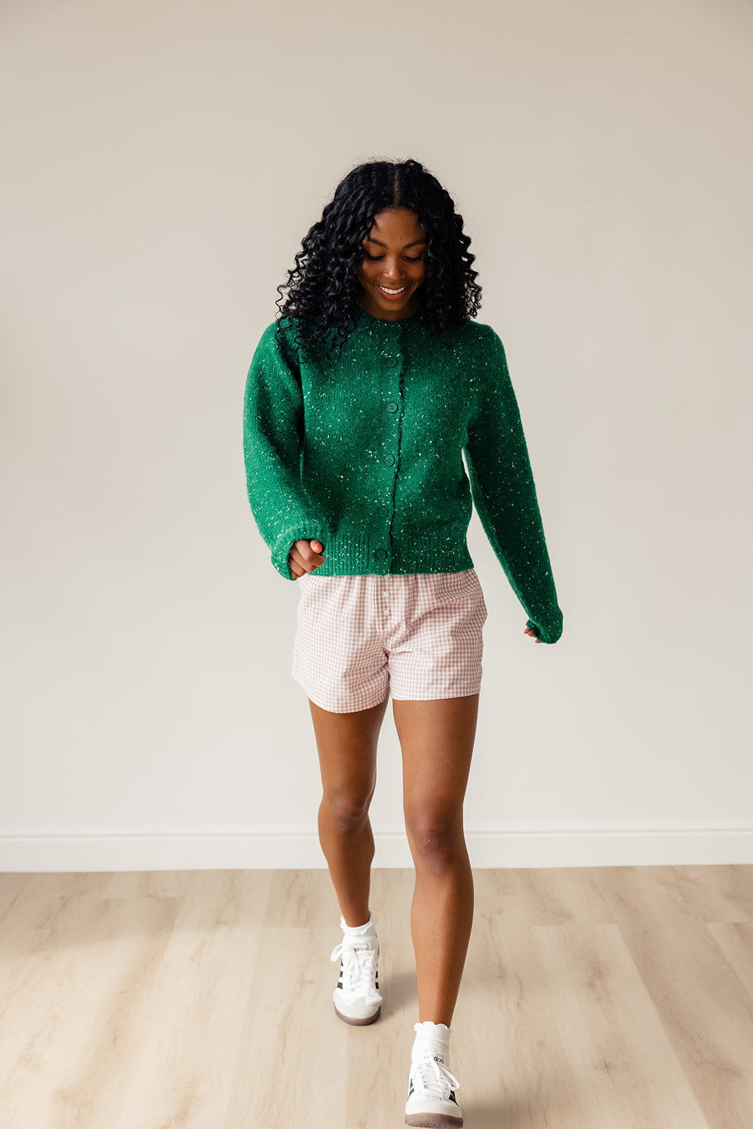 // paired with the defying gravity speckled cardigan in green