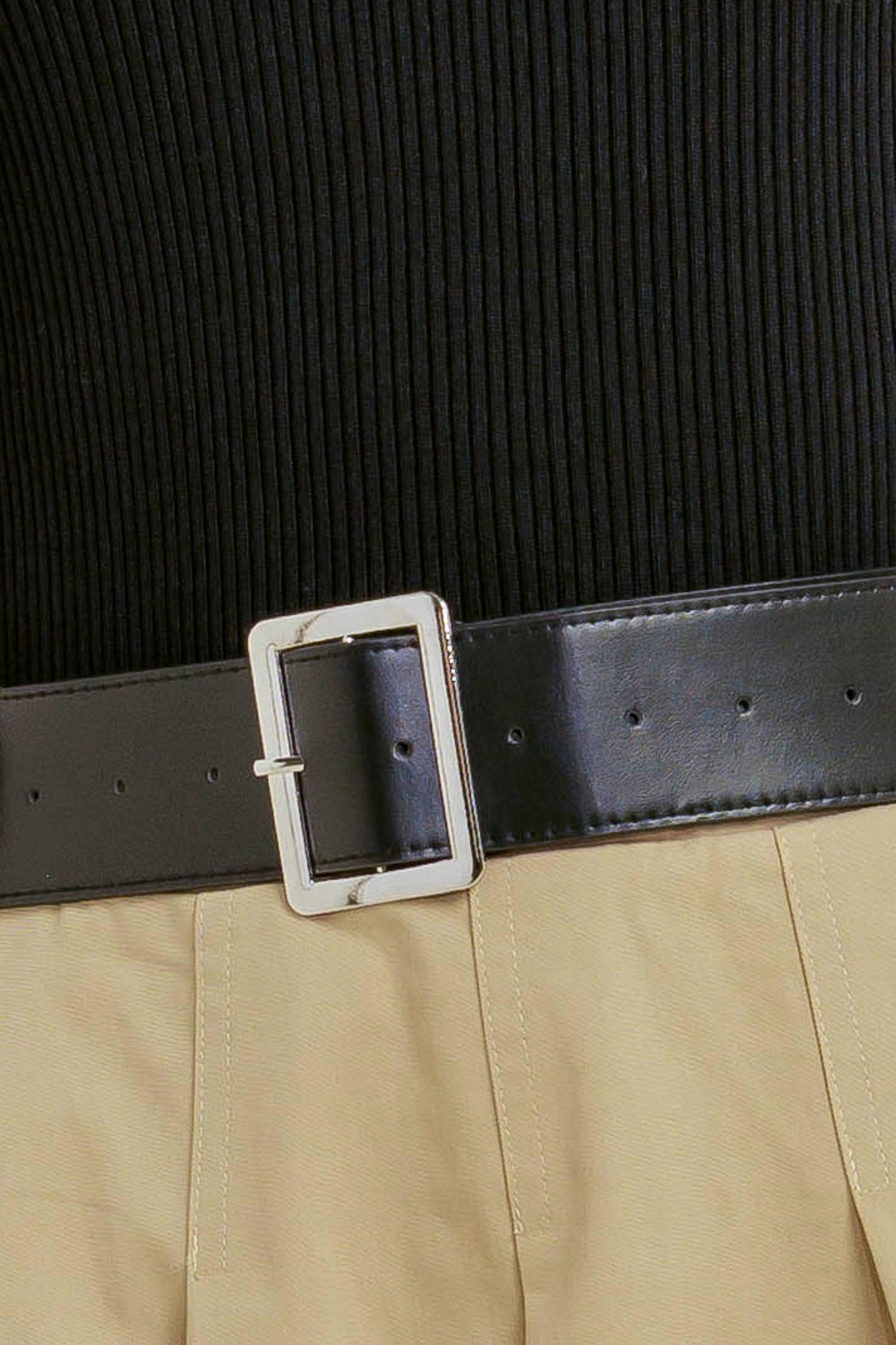 A sweater knit top and woven skirt dress featuring round neckline, short sleeve, contrasting belt, full midi skirt and back zipper closure
