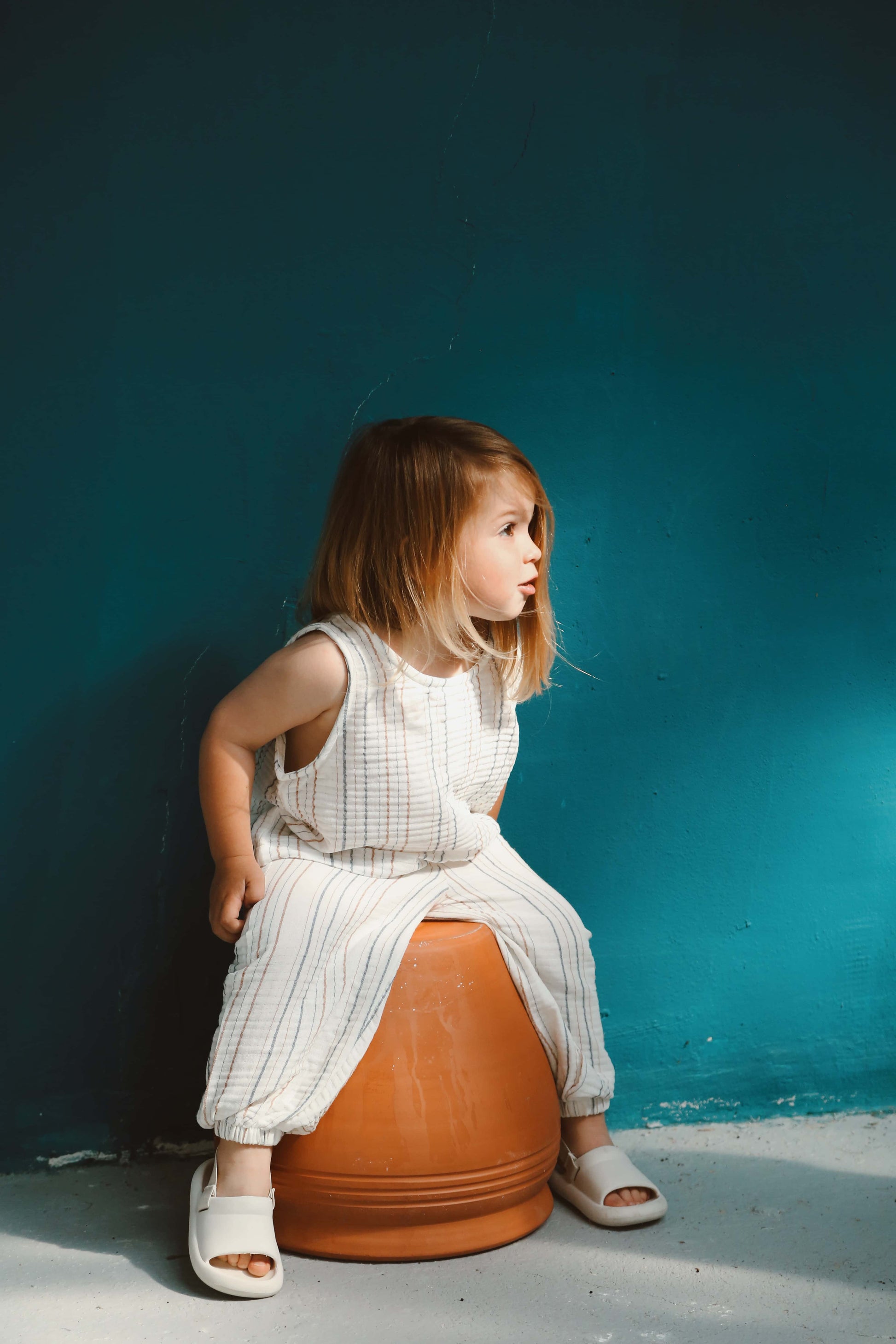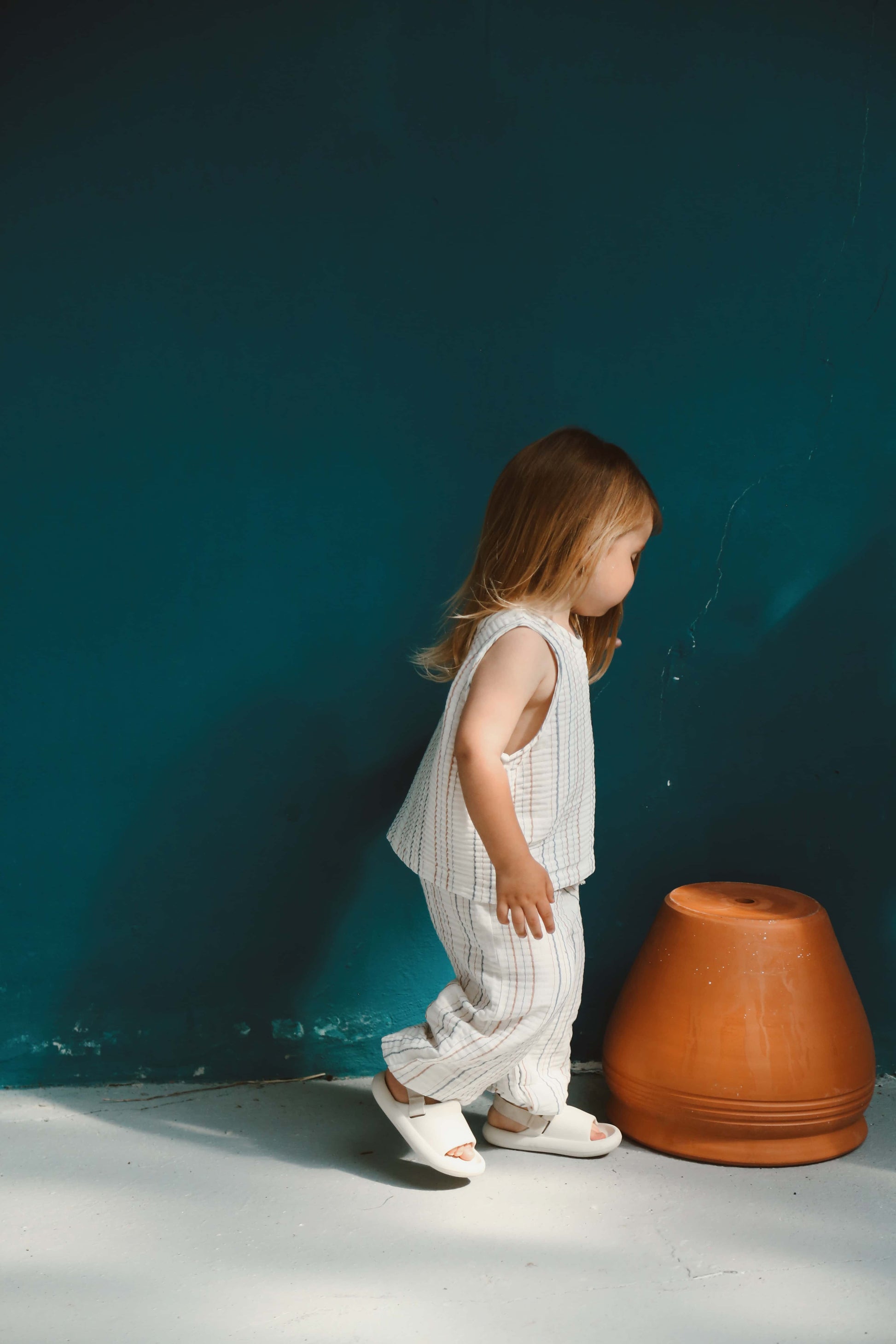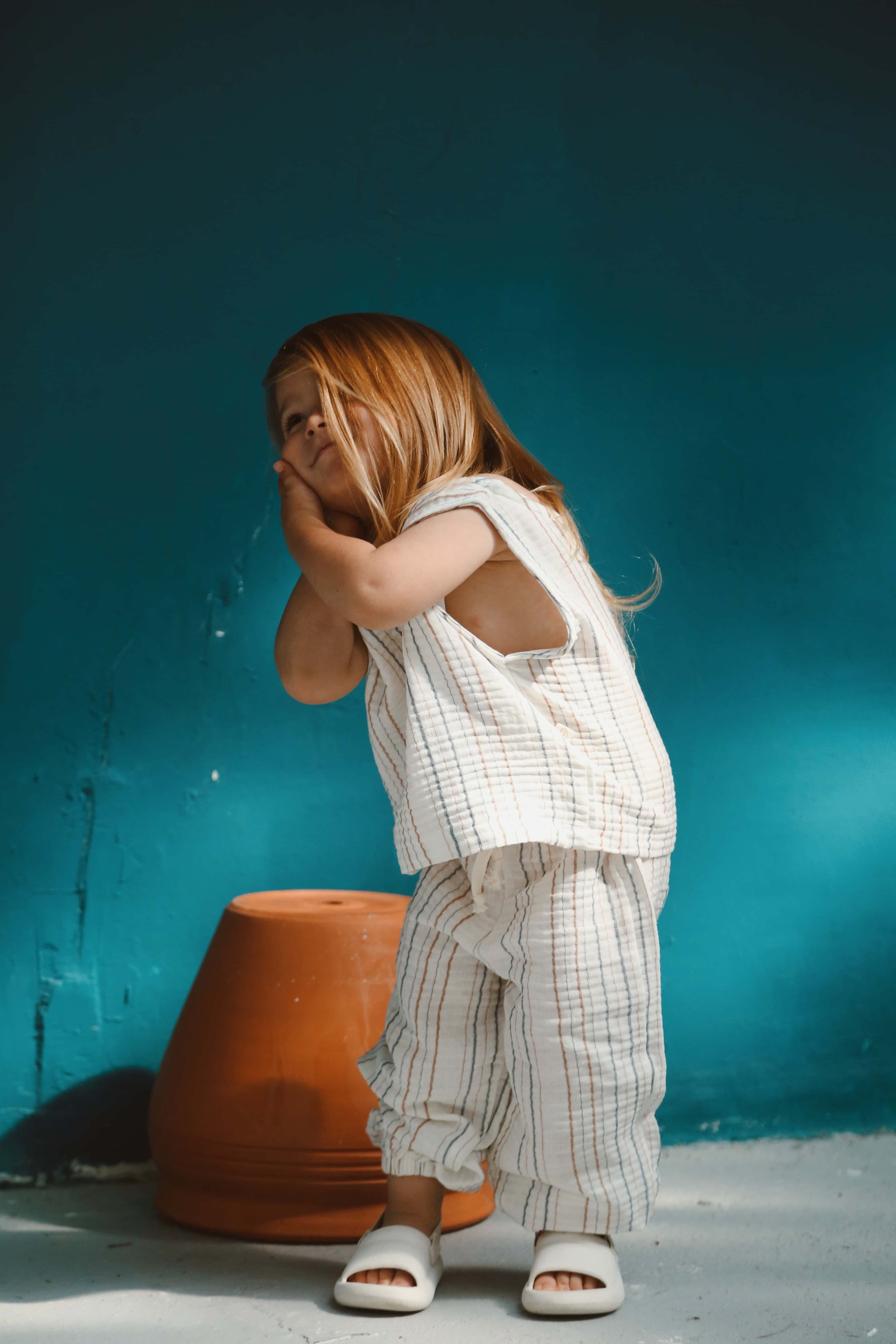 Breezy and effortless, our Seaside Stripe Two-Piece Set is made for warm weather days and carefree play. This sleeveless top and wide-leg pant combo is crafted from ultra-soft double gauze cotton, featuring subtle stripes in earthy tones for a naturally relaxed look. The loose fit keeps little ones cool and comfy, whether they're out adventuring or lounging in the shade.