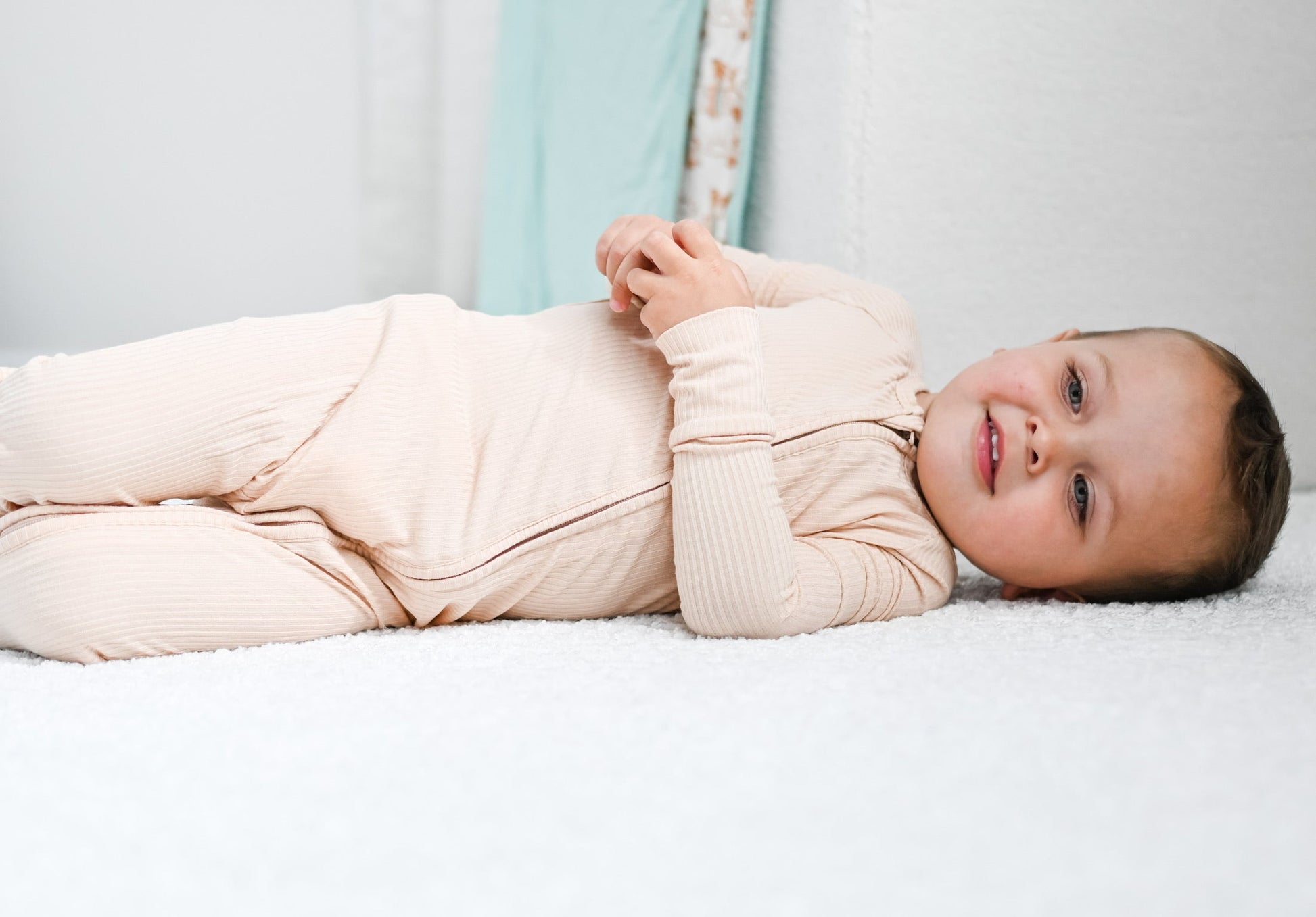 Make bedtime an adventure with the Tan Rib Dream Romper! Made with bamboo fabric, it's as comfortable as it gets for boys and girls alike. Send 'em off to another world of restful dreams and be the hero of their happy morning tomorrow. #bedtimechampion!