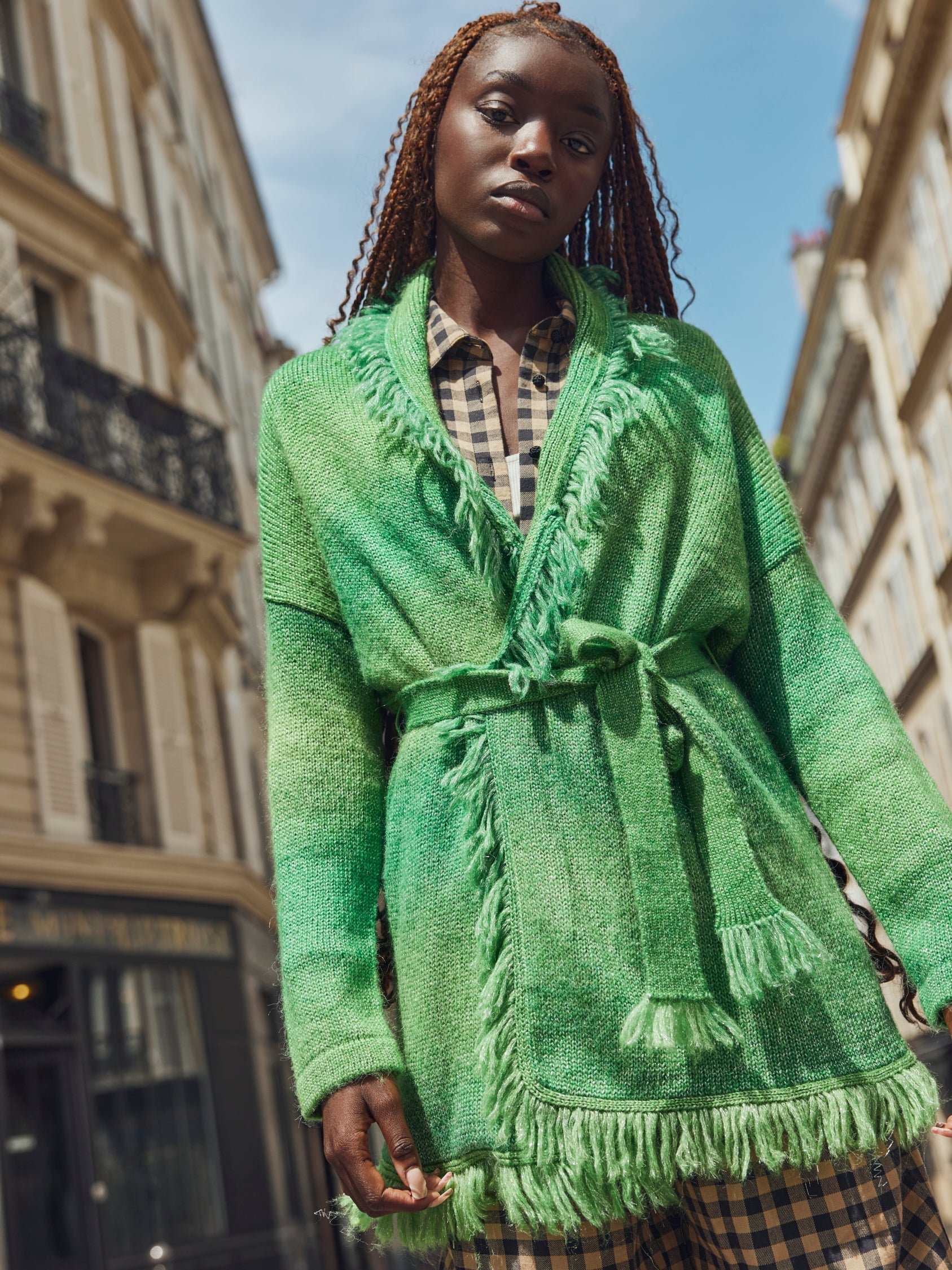 Introducing Tatiana. A fringe trimmed cardigan featuring a shawl collar and remove-able waist belt. Offering options to tie too close or leave relaxed and casual. Subtle shimmer is thoughtfully woven into this soft knit giving slight sparkle as the light hits you