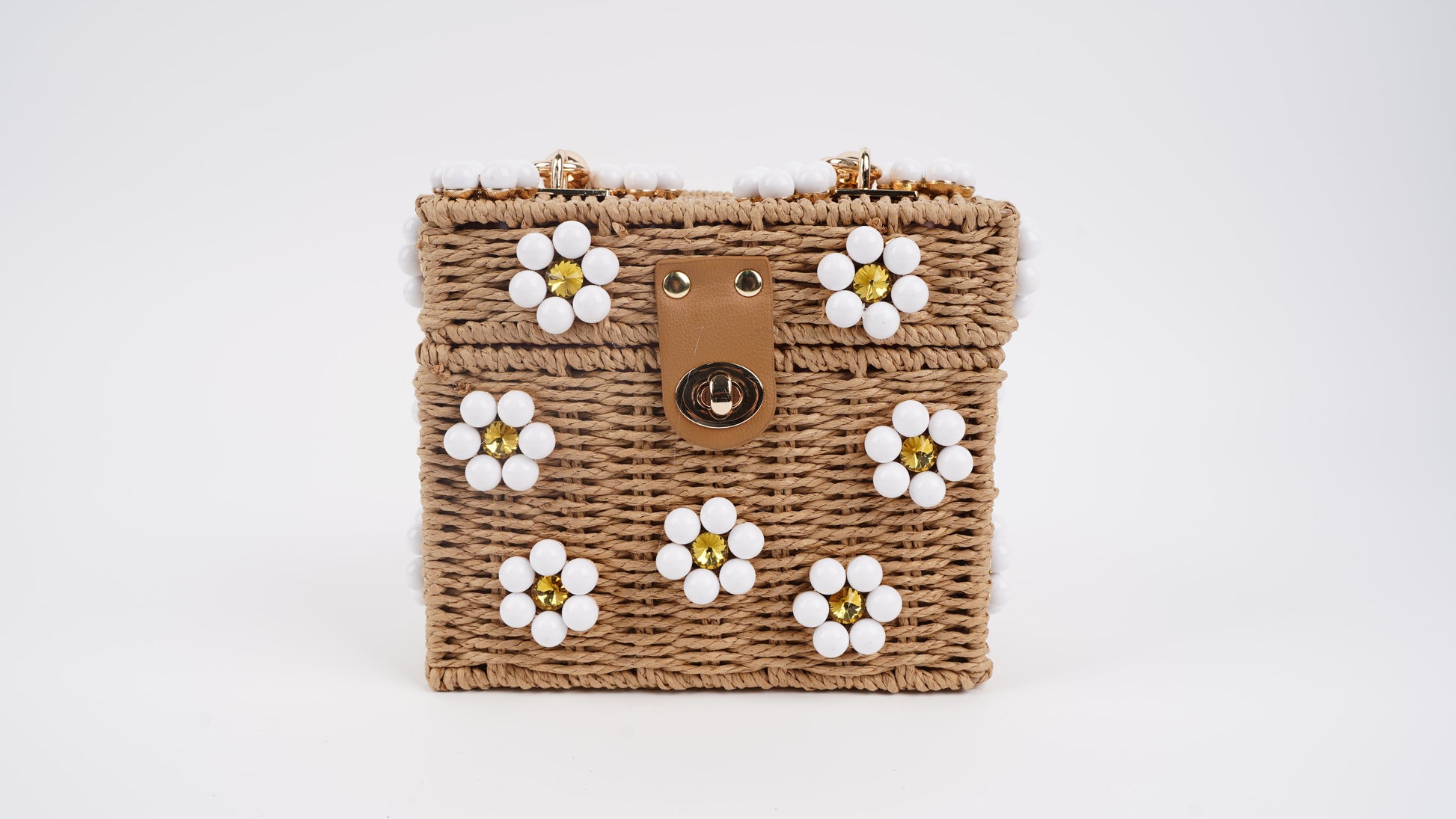 Tan/Khaki Purse + White Daisy with Yellow Rhinestone Center