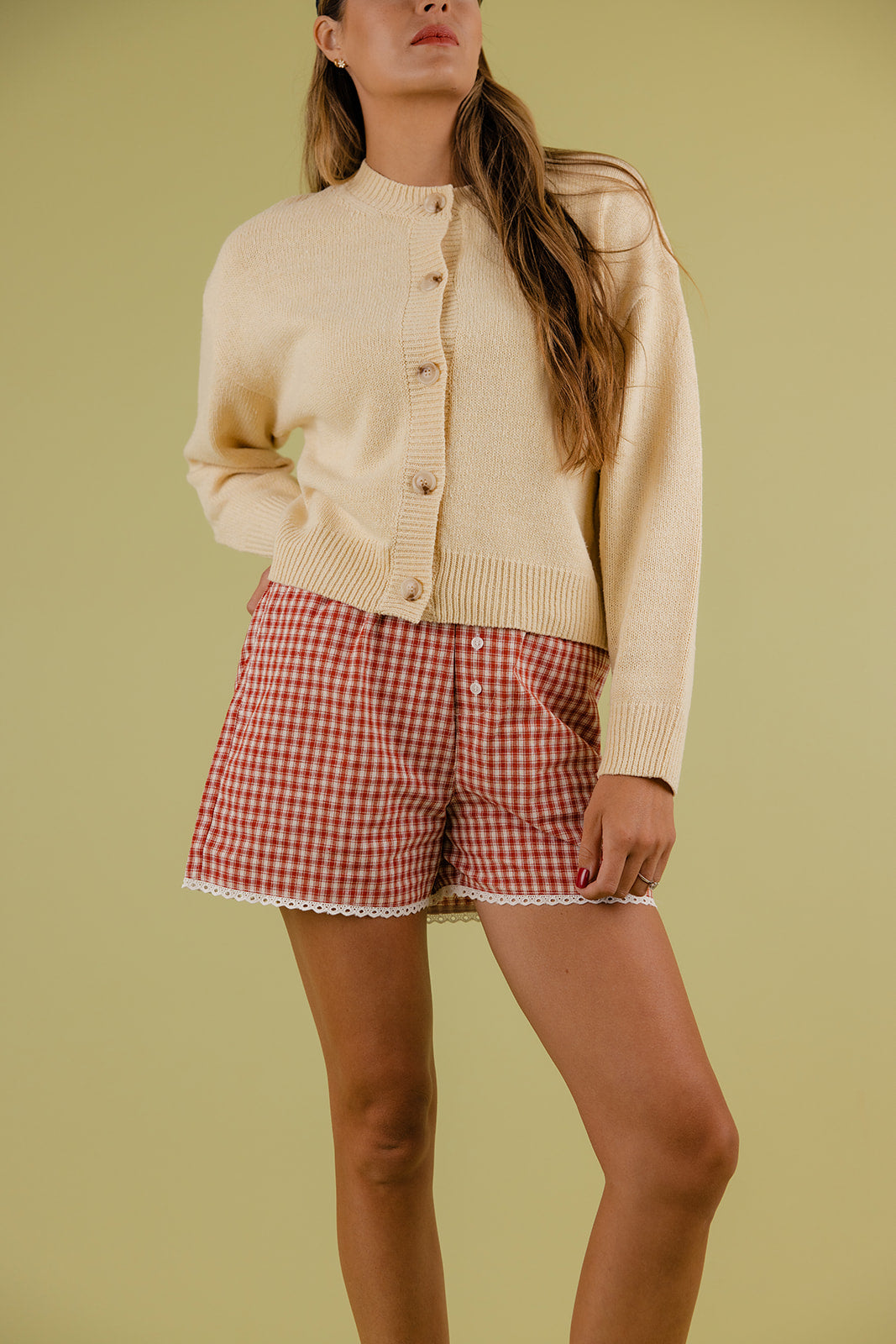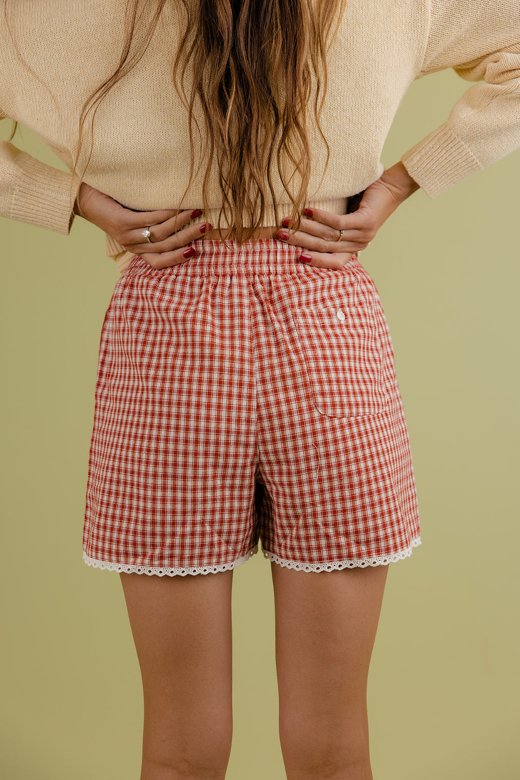 The most perfect Christmas shorts are here! Pair with your favorite holiday sweaters and get tucked in on Christmas Eve in a festive outfit! Featuring an elastic waistband, lace trim, and slit pockets, these will be an instant fav.