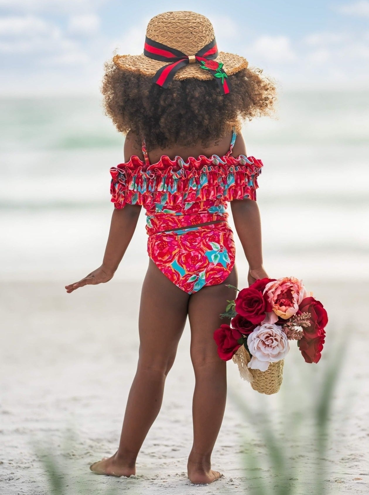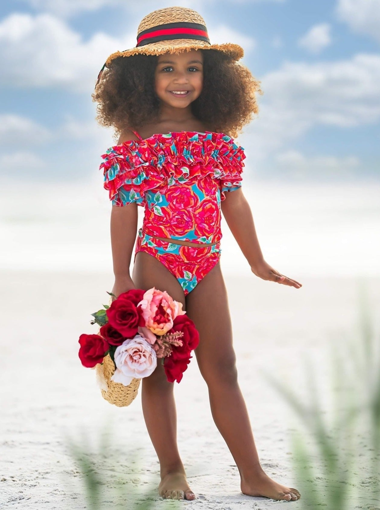 - These blooms blossom near the sea thanks to our ruffle tankini two-piece swimsuit for girls. The rows of ruffles elevate this already stylish swim set. But the vibrant red roses and green leaves will make a big splash at the next pool party or vacation.