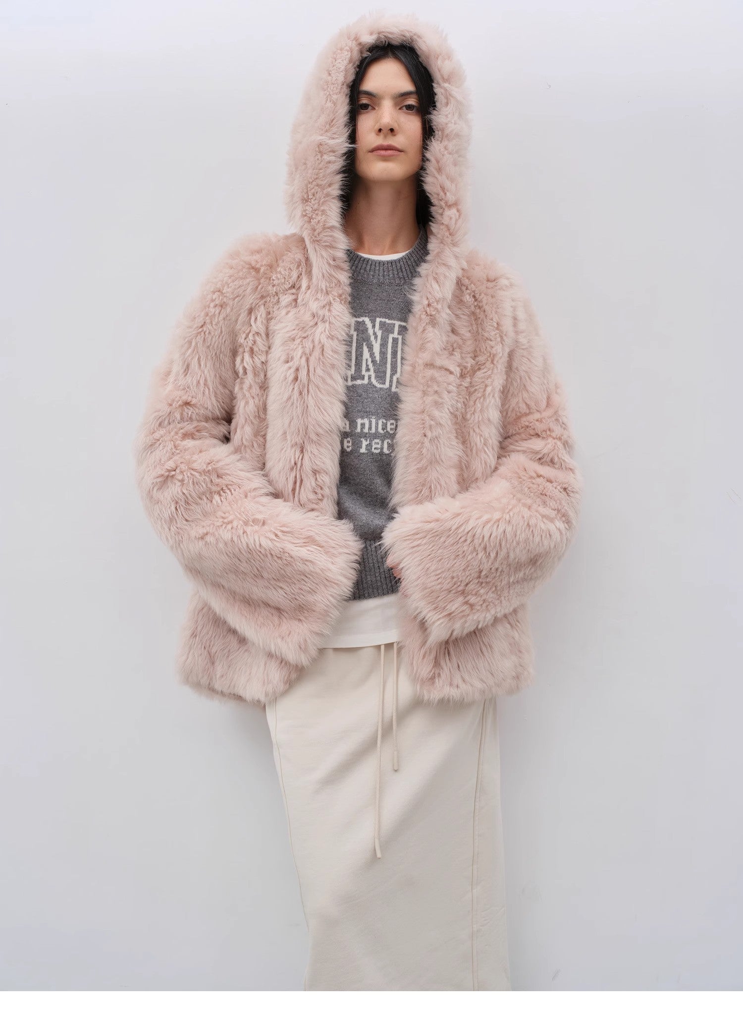 The raw material is carefully selected lamb curly fur skin, which is rare in production and impeccable in appearance. The fur is rich and fluffy, three-dimensional and full, with a natural curl. The fur surface is fine, and the touch is as fluffy and dense as clouds, smooth and lustrous, with full and sufficient fur, delicate and softened, and good warming and warmth performance.