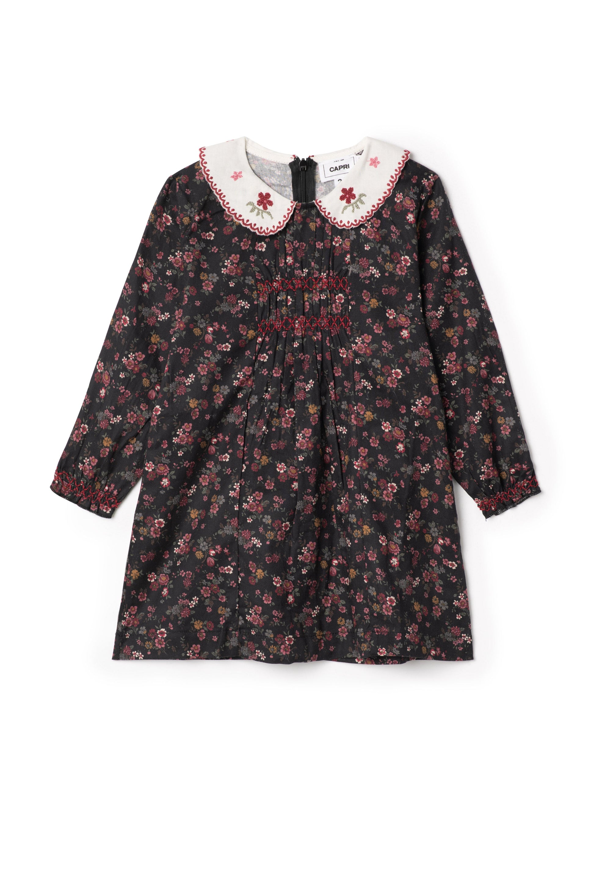 Girls long sleeve woven dress with embroidered collar, center back invisible zipper and elastic at cuffs. ֲ
